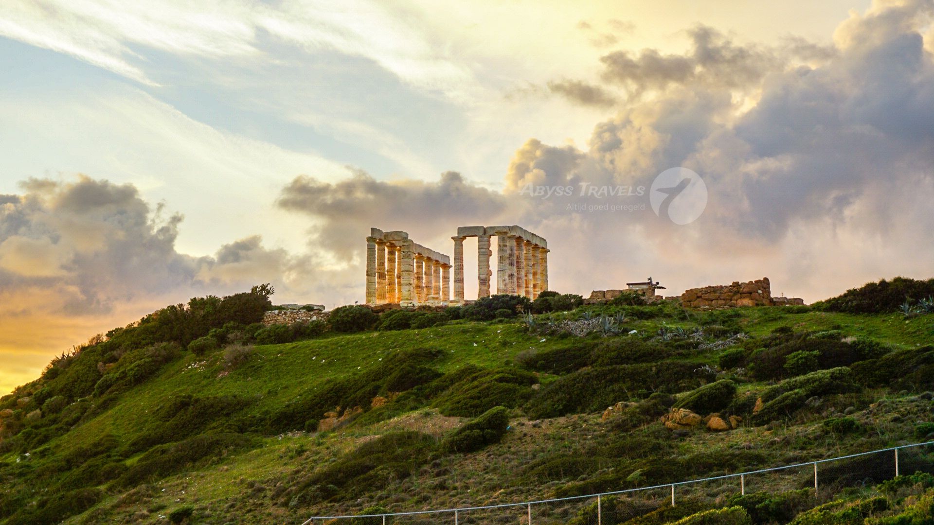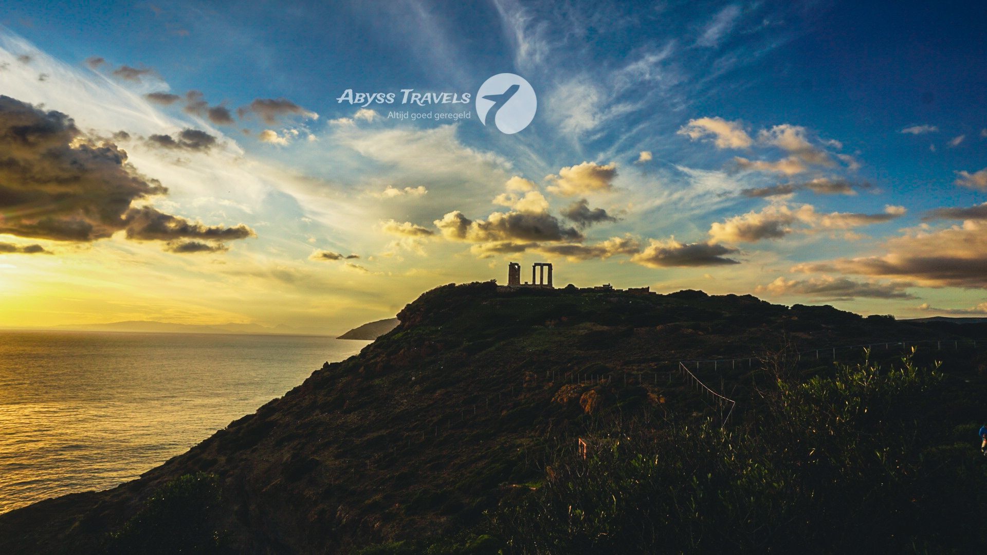 Kaap Sounion ligt majestueus op een klif aan de Egeïsche Zee en is beroemd om de Tempel van Poseidon, gewijd aan de god van de zee. De tempel is een van de mooiste voorbeelden van klassieke Griekse architectuur. De locatie is magisch: witte marmeren zuilen die uitkijken over een eindeloze horizon. Vooral rond zonsondergang is dit een iconische plek, zoals hieronder te zien is.